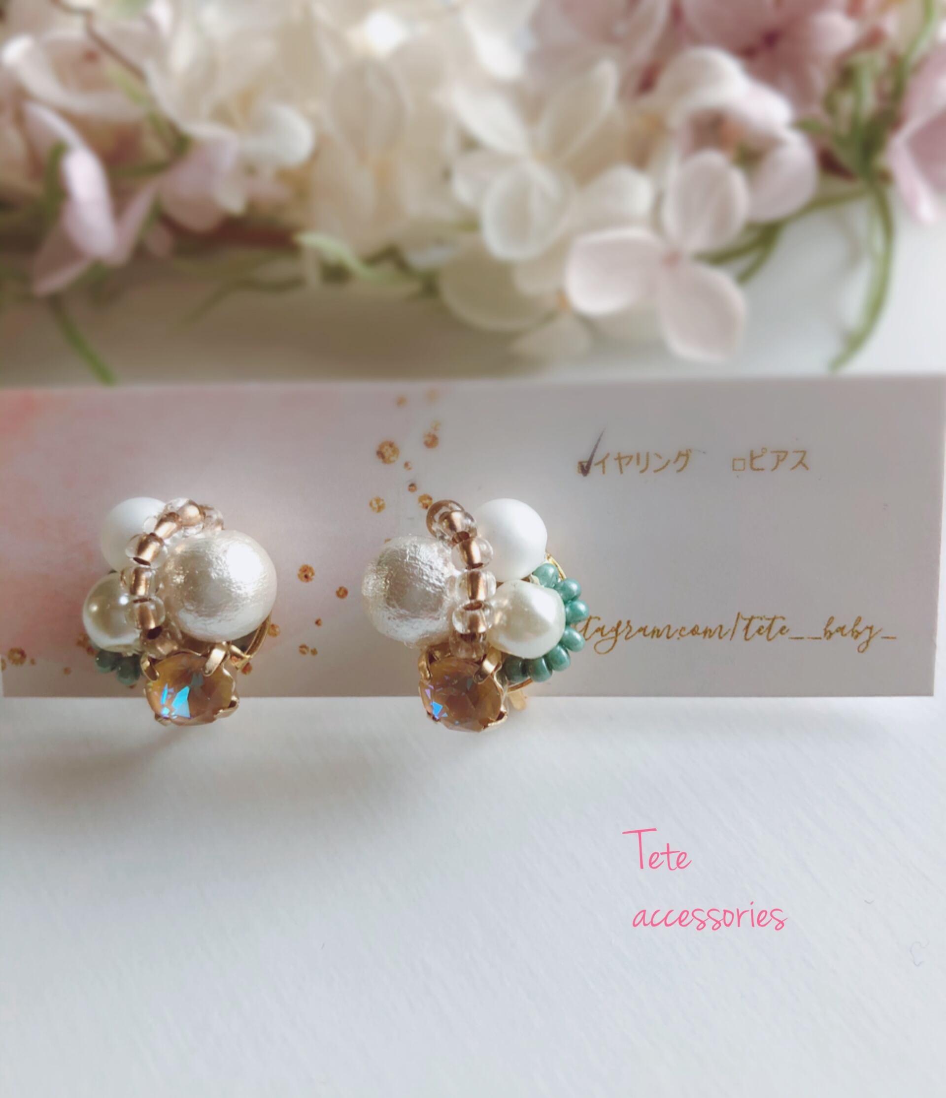 ベージュ系のスワロフスキーとミント系のビーズがアクセントになったクラシックな雰囲気です♡