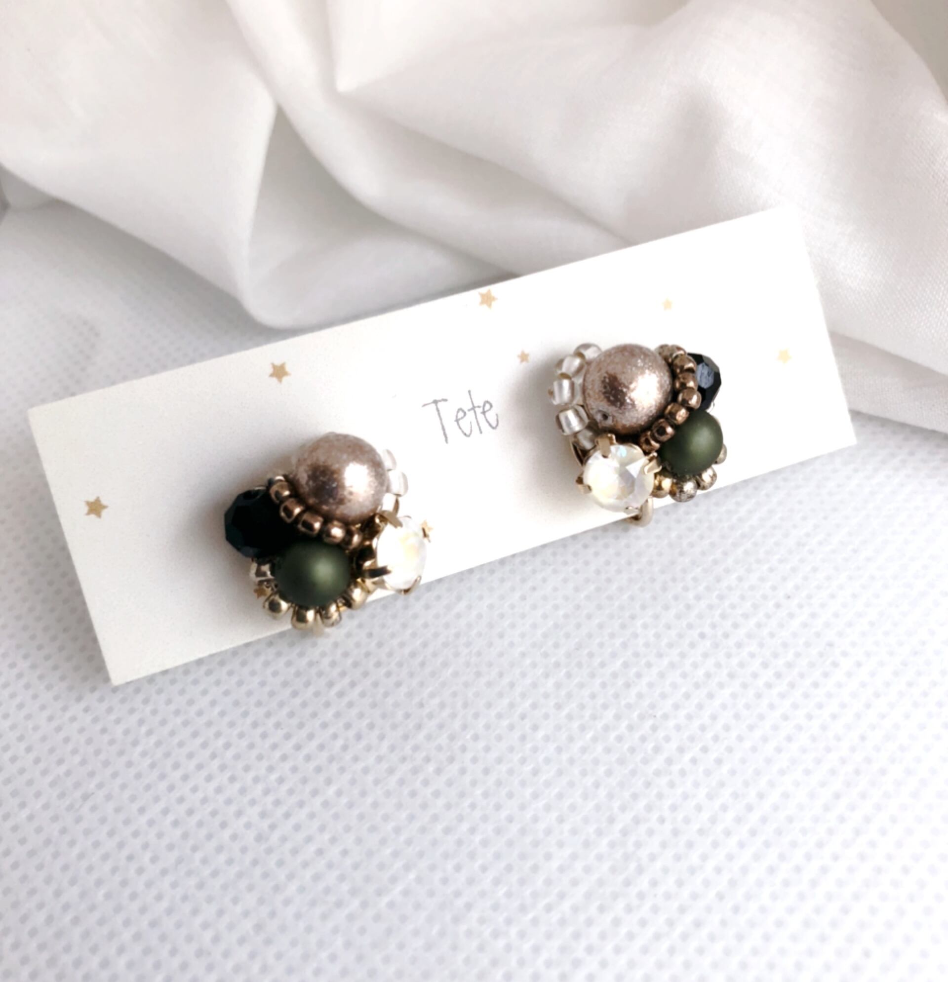 カーキ×黒×白 カッコ可愛いビジューイヤリング